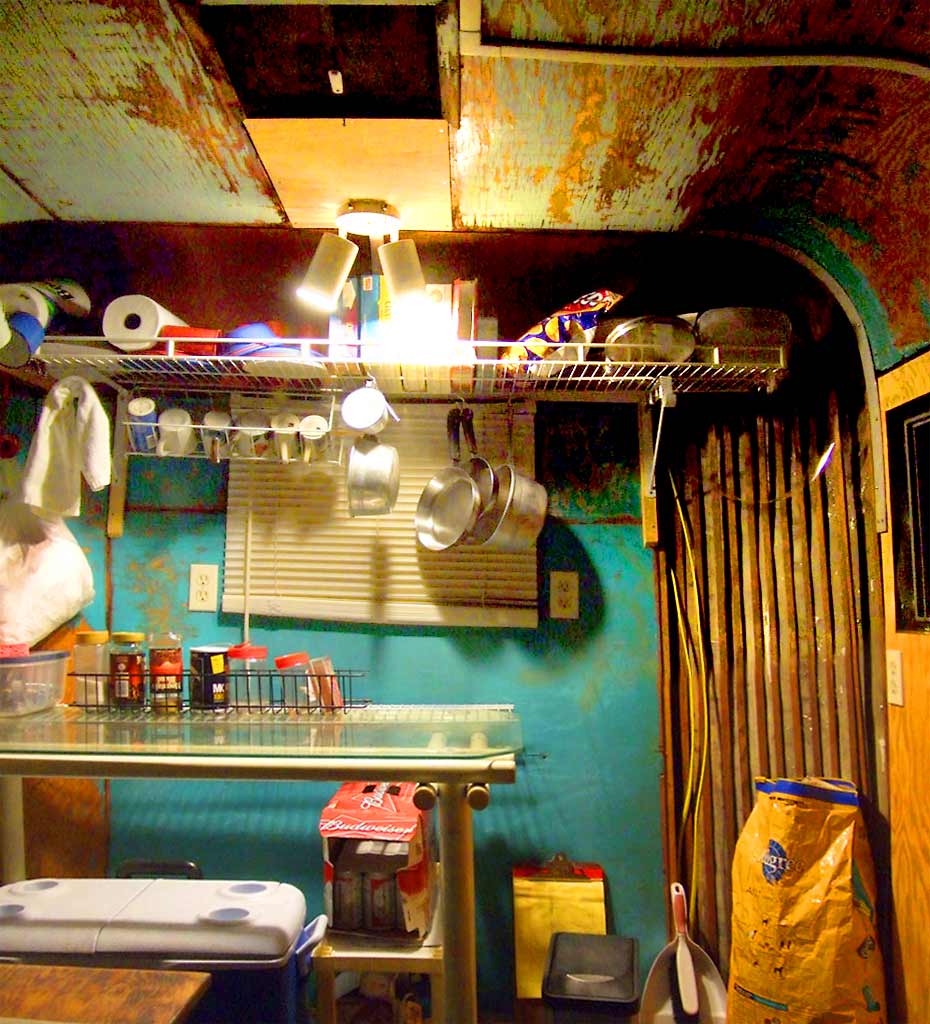 ![]() One wire within the slat corner leads to the two outlets on the front wall. The other wire enters a PVC track up behind the wire shelf which then travels over and up into the lamp. An identicle track can be seen in the foreground of the ceiling which goes from a wall switch to another lamp. Copyright © 2008, Van Blakeman |