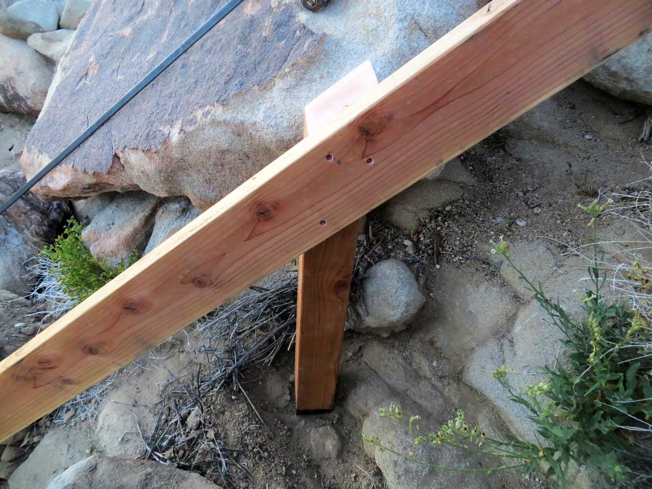 Attaching a short center post on bedrock to carry this hillside staircase over the rocks