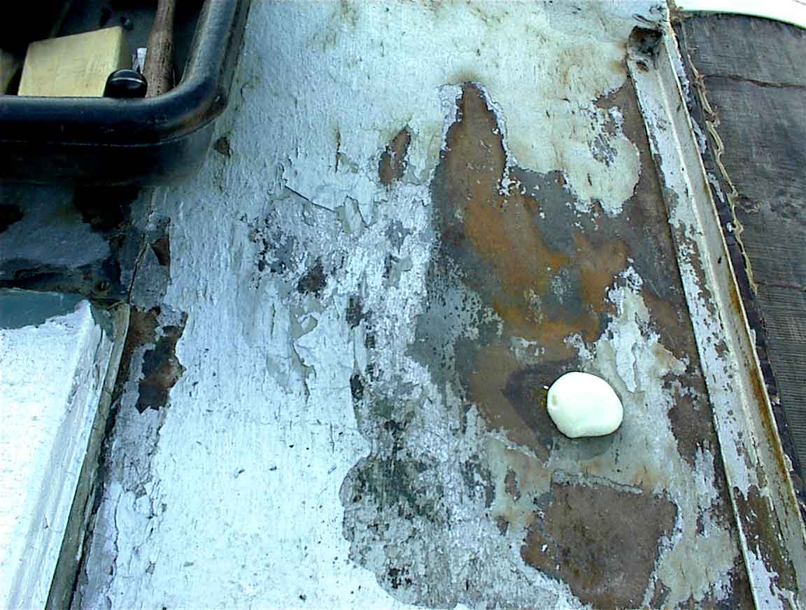 Foam growing from a hole in the tin Branstrator trailer roof as it expands