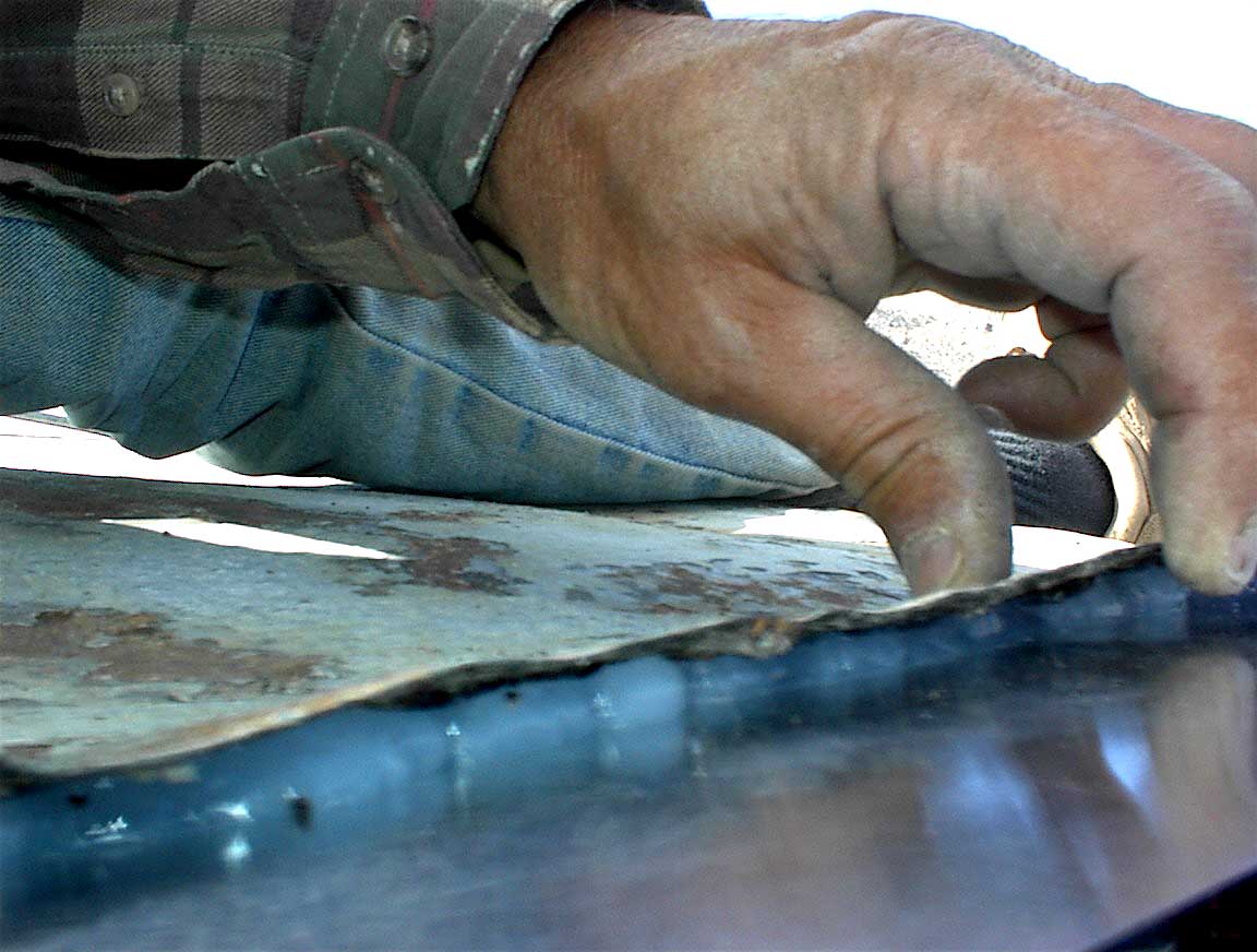 Flashing is slipped under the old tin and over the new shingle. A heavy bead of silicone will fill any gaps.