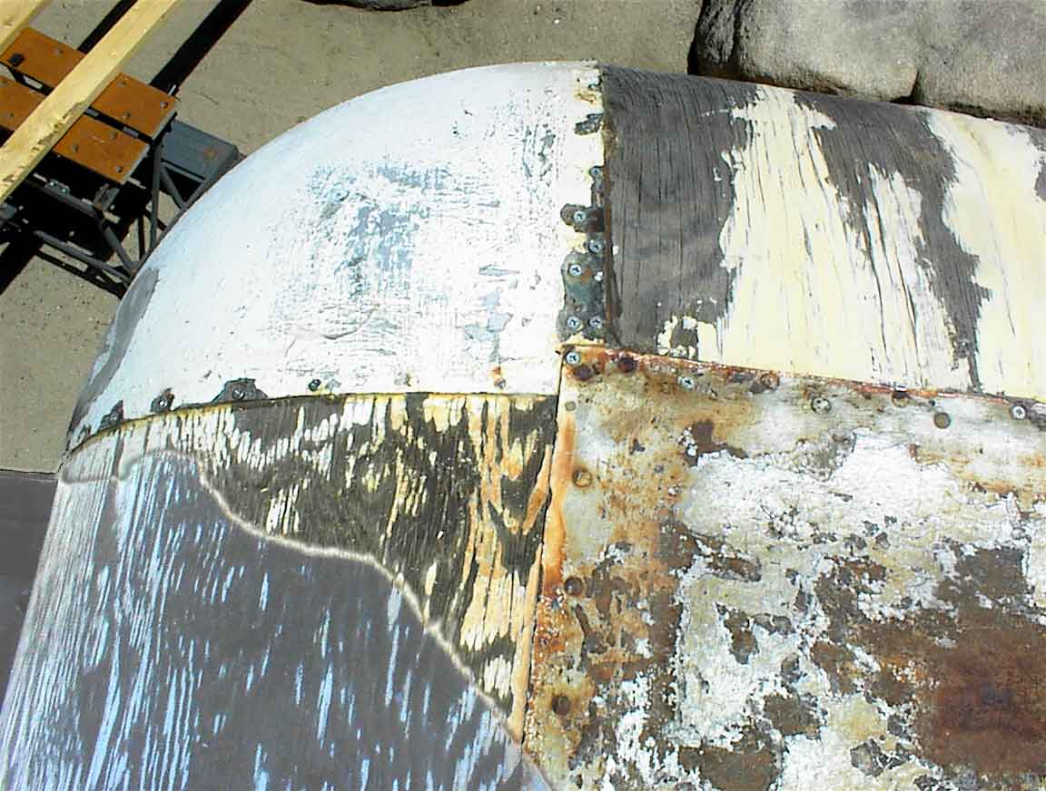 Most nails on the old Branstrator trailer tin roof are replaced by glue or silicone and screws
