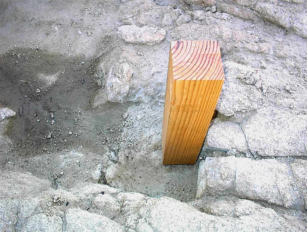 Redwood post on an aluminum foot around a PVC pipe embedded in a concrete pier