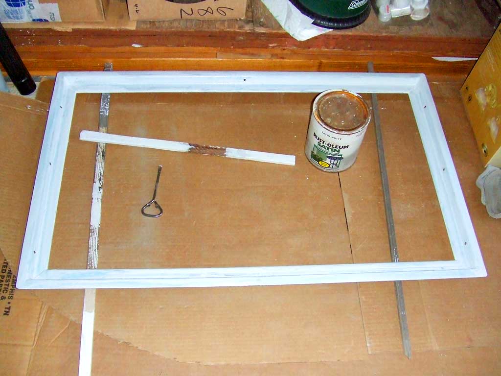 Priming the old metal window frame for use in the new wall at the rear of the trailer