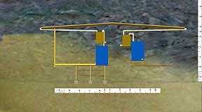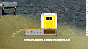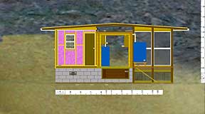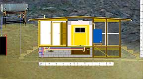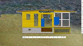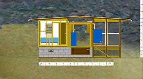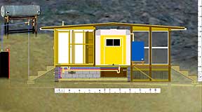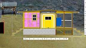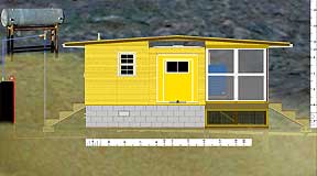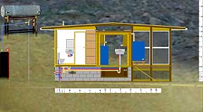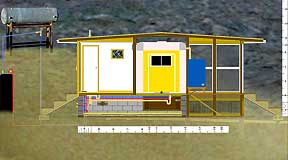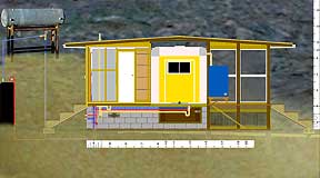 |   1. The Prospective Side View, 2002. |   |   2. Behind the sheathing | Modular construction allows for eventual move to higher arroyo. |   |