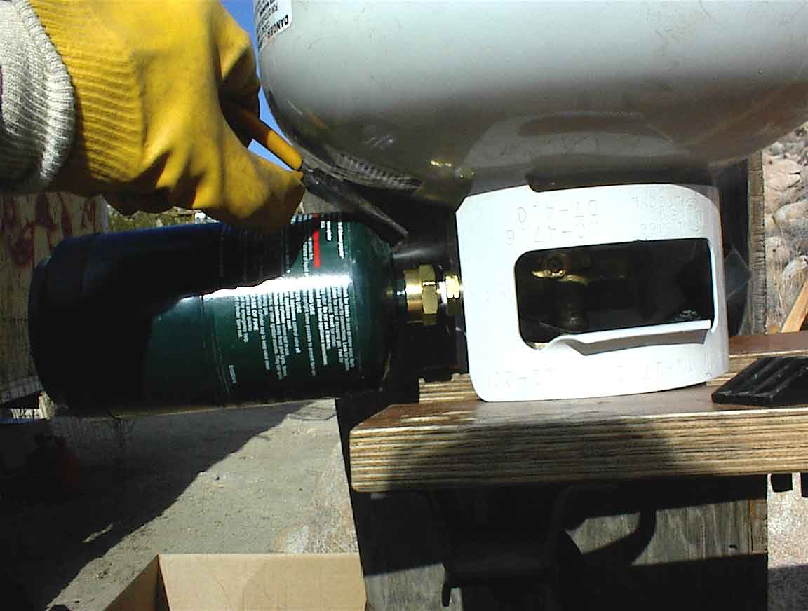Filling a small propane tank from a 25 gallon tank with a special adapter