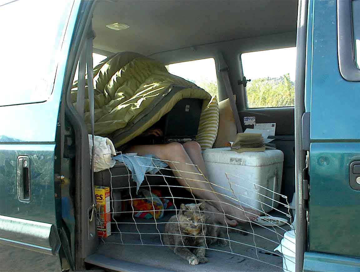 Sexy lady with Missy the cat computing in the van