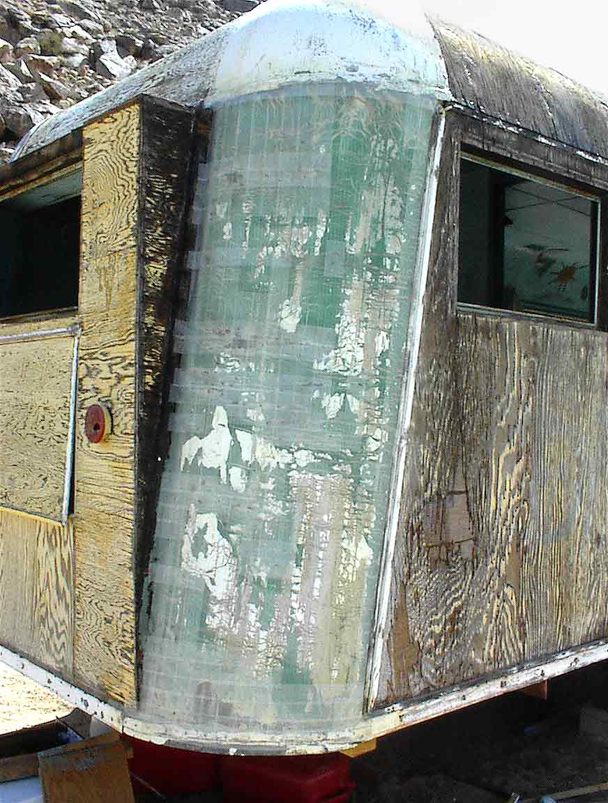 Trailer corner canvas mended with fiberglass tape and spray adhesive