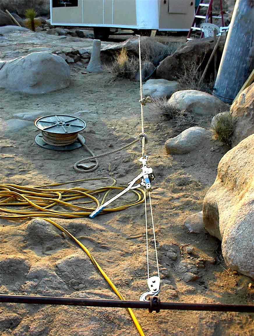 Roping and winching our trailer into its new position in 2002