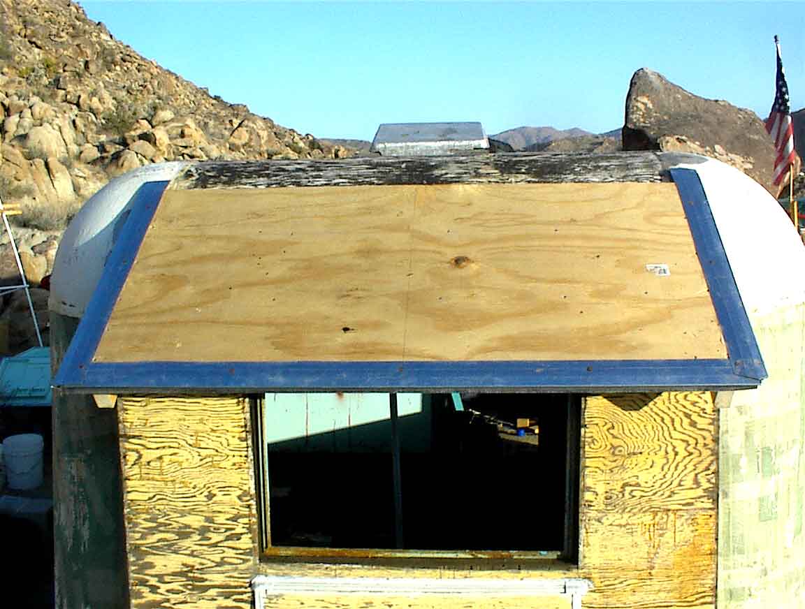 Nailing drip-edging over a bead of silicone sealant on the new awning of the old Branstrator trailer roof