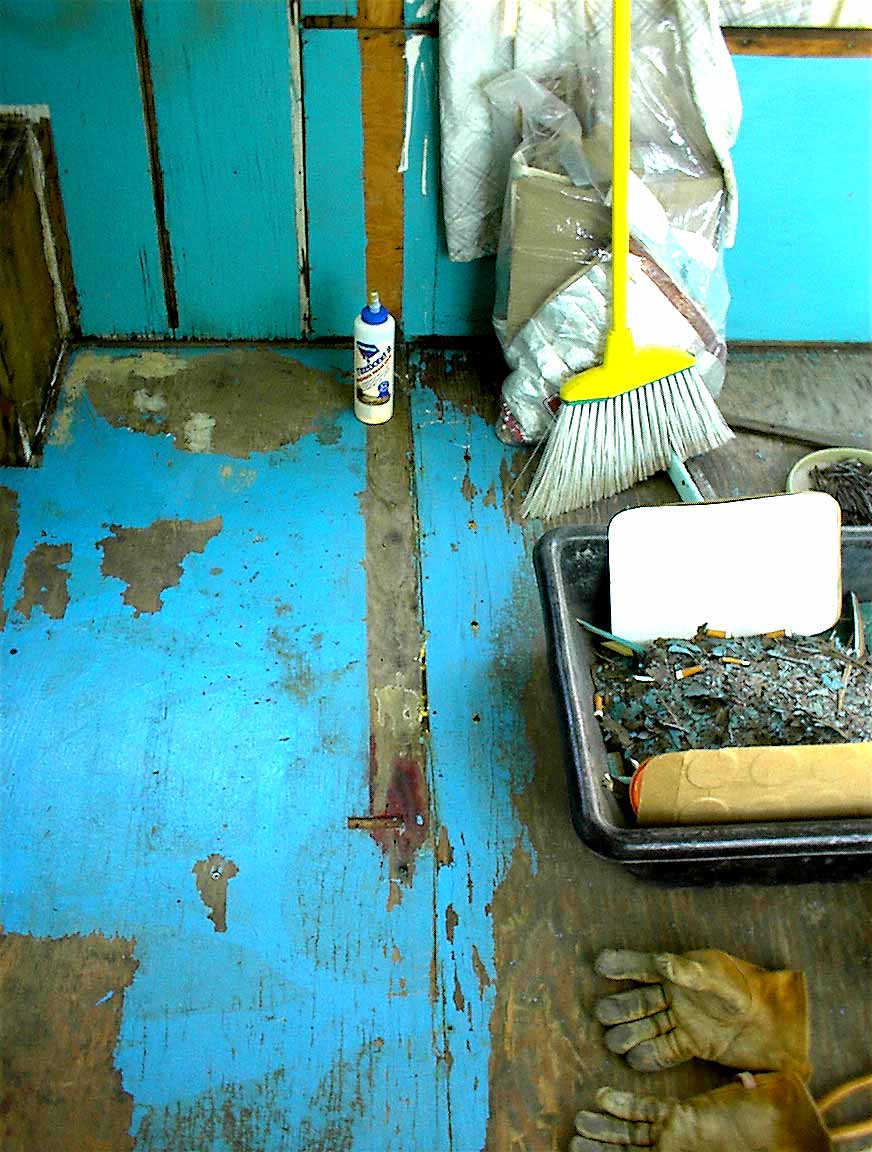 Glueing cracks and scraping old paint from the Branstrator trailer floor