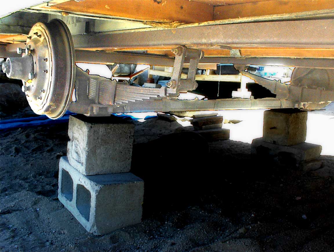 The Branstrator trailer wheel and spring mechanism and the iron framing on blocks