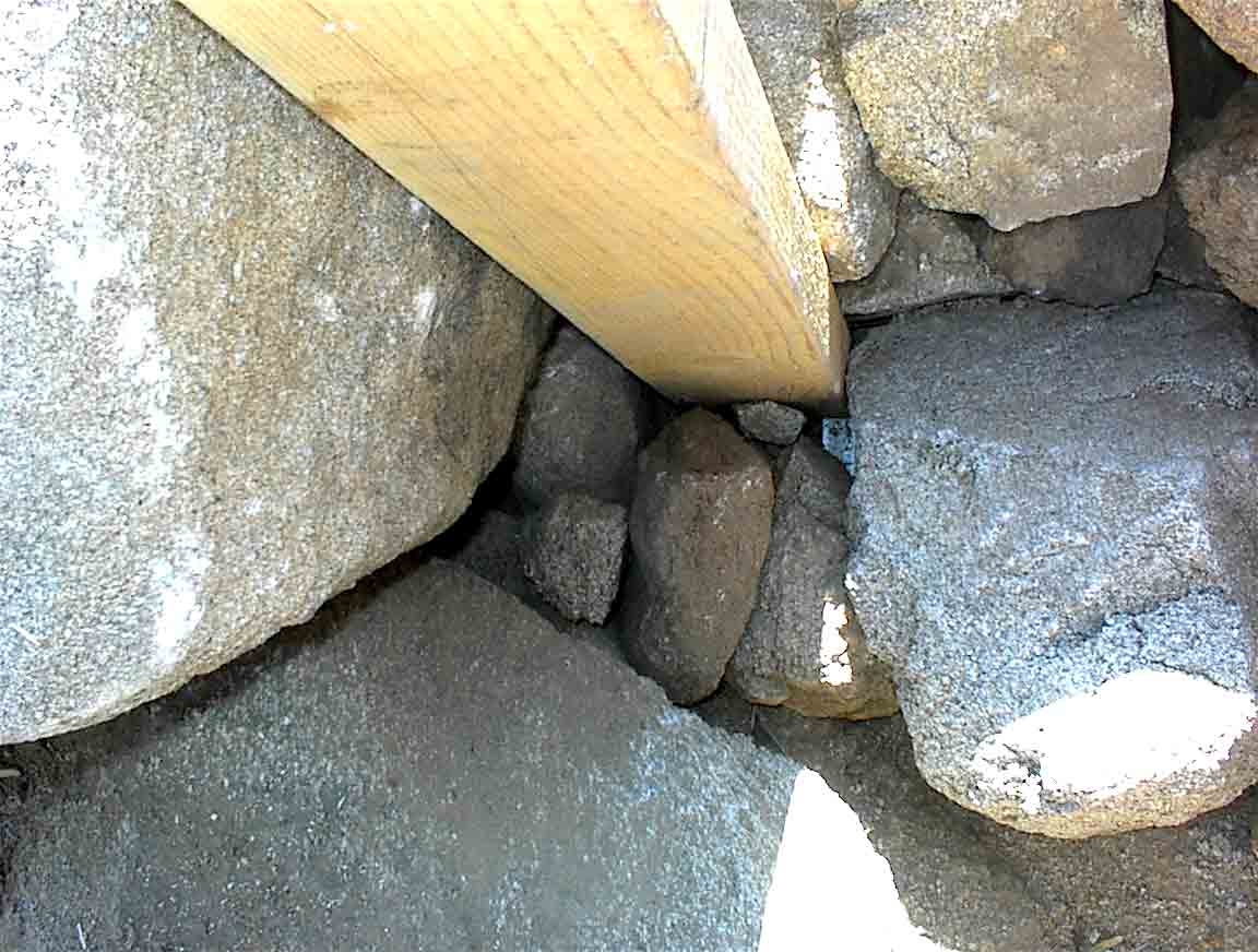 Locking in the water storage rack legs with rock.