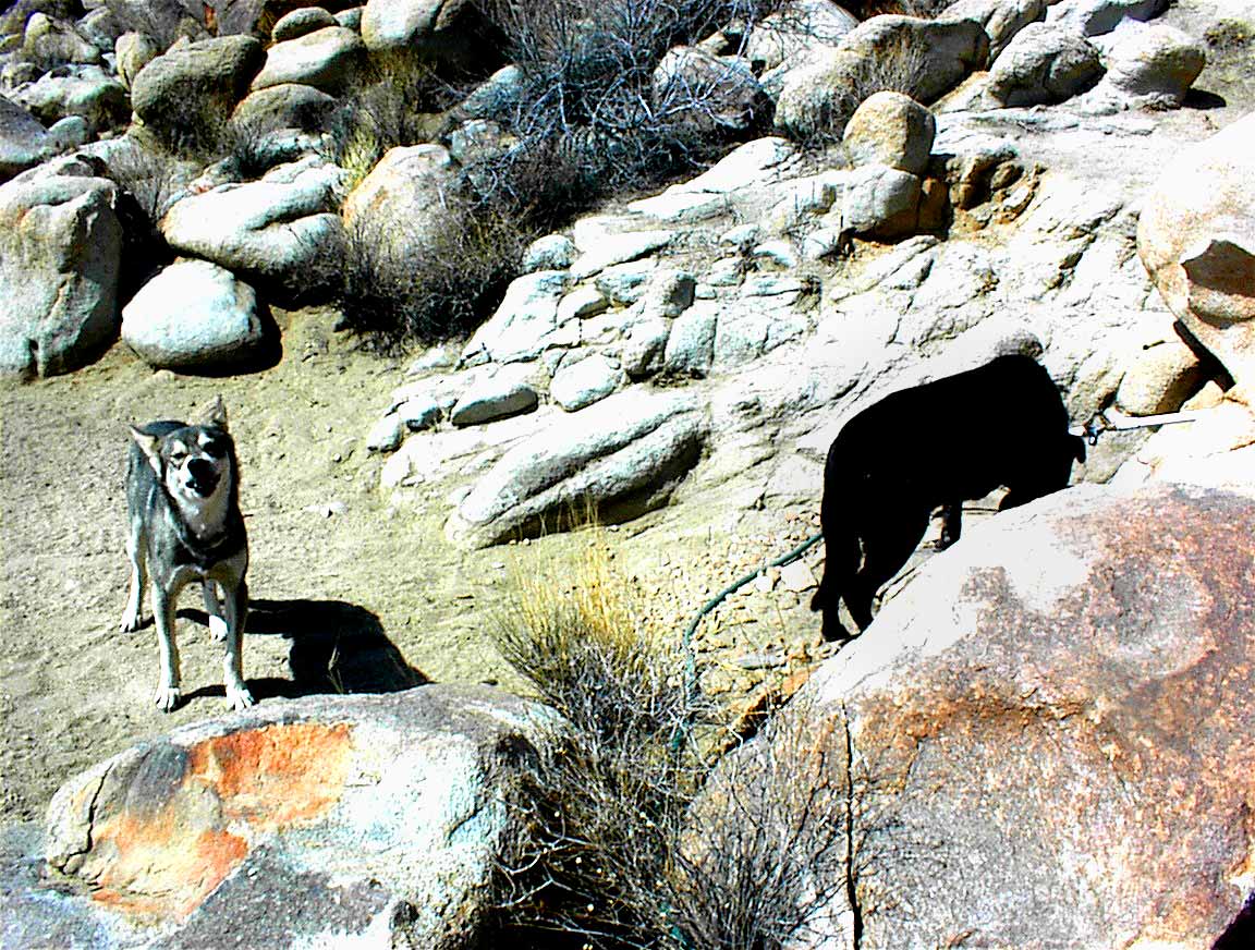 Dogs Lightfoot and Mo in the Joshua Tree Rocks.