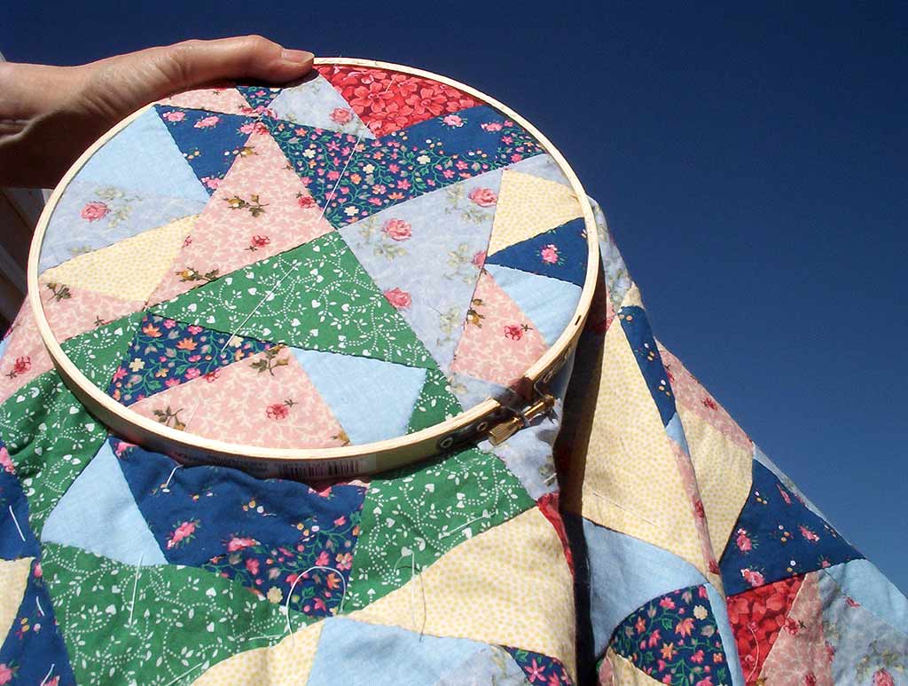 Eileen Blakeman stitching a new quilt in a wooden ring
