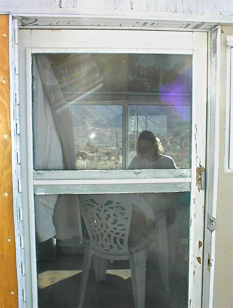 The Branstrator trailer screen door with Eileen Blakeman relaxing