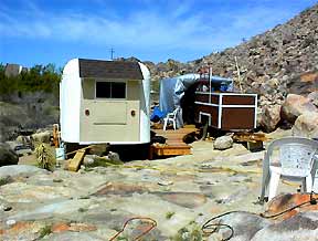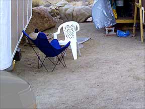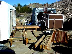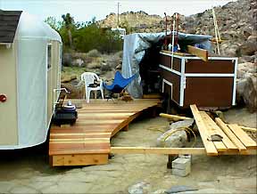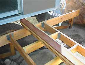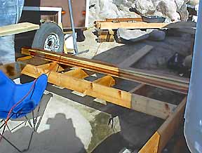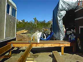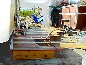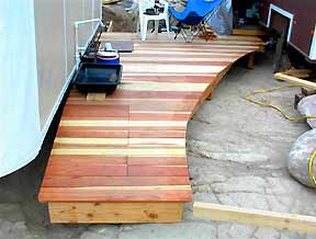 An evenly bent PVC pipe (originally used to reach & vacuum rust out of the water tank ) & an extension cord serve as a template for marking the curve of the deck. |