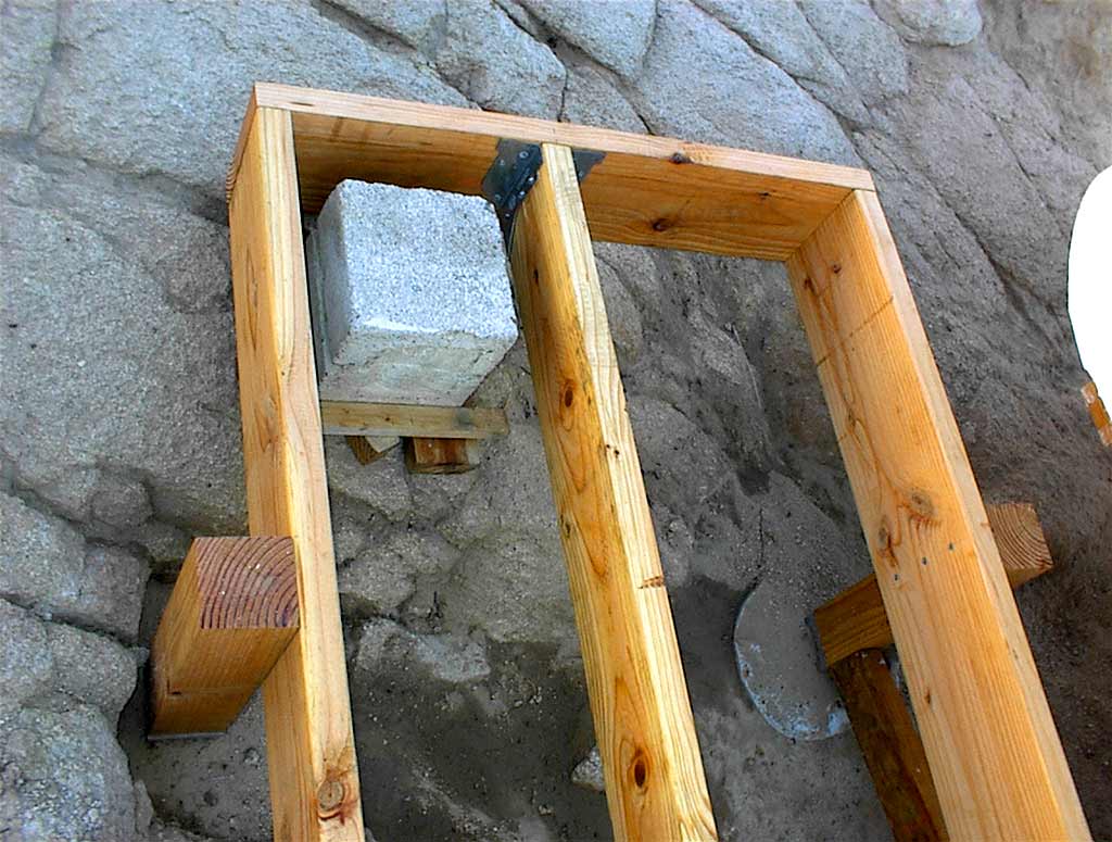 Posts on aluminum feet around PVC pipes embedded in concrete footings
