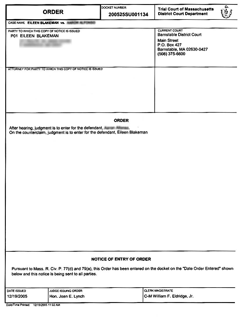 A MA court judgement against our deliquent former tenants in favor of Eileen Blakeman