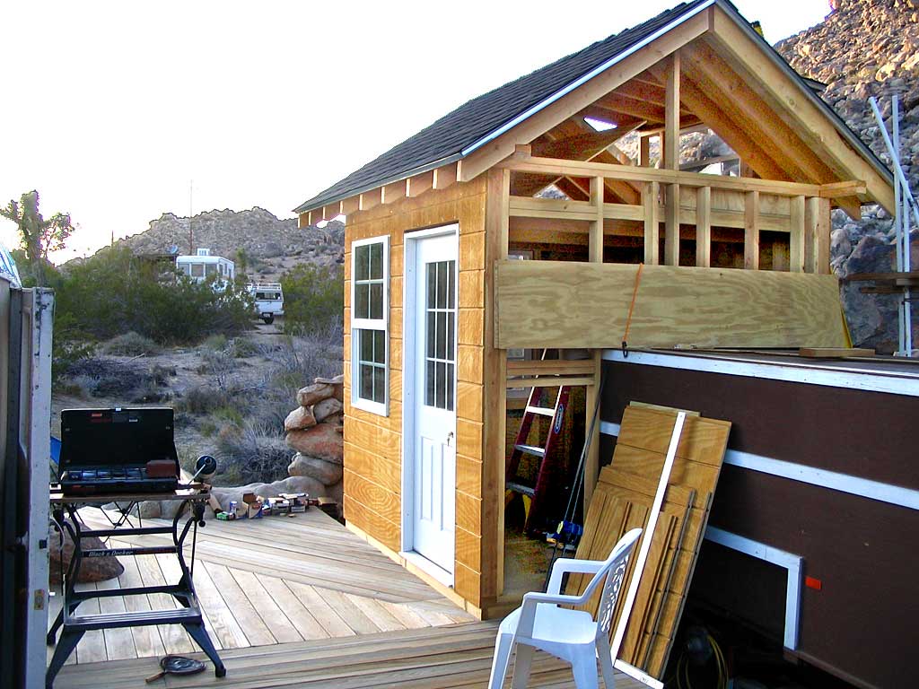 Our shed is roofed, paneled on three sides, and the door and two windows are in