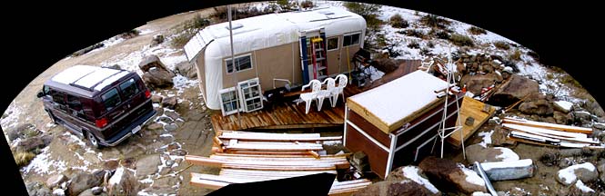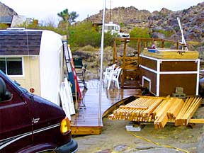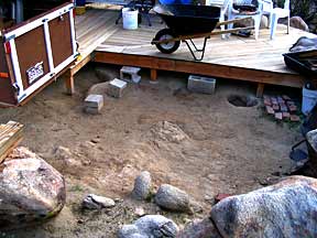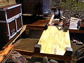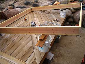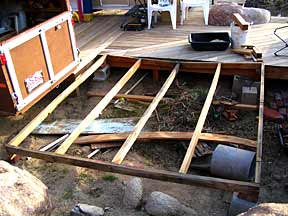 |  | The wall framing, 3 of the ceiling joists, and the dormer floor are in | 03/19/06: two weeks into the job | Working out rafter angles and ridge position to allow for head room and window |