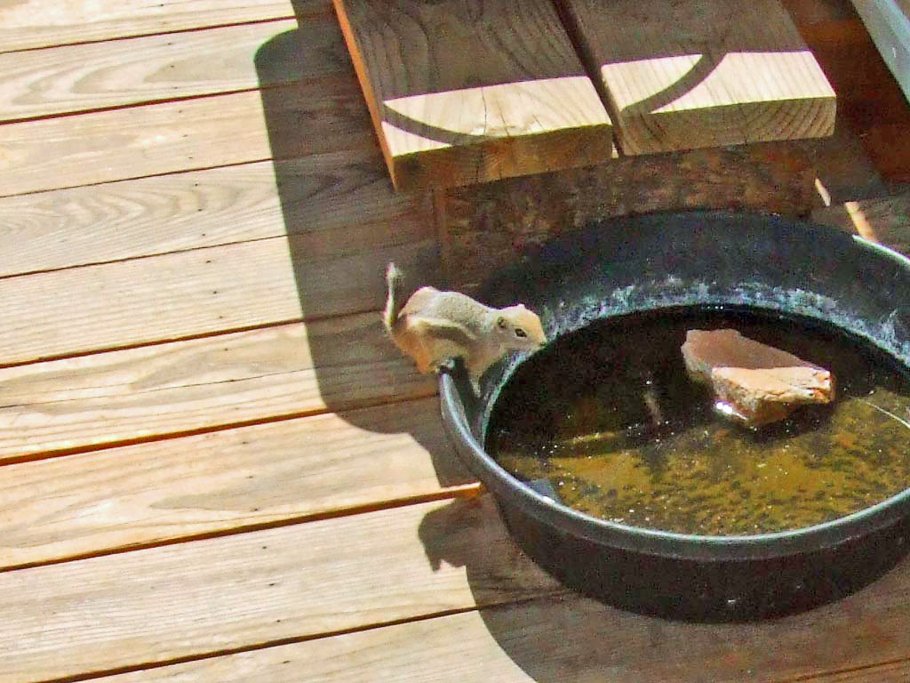 A white-tailed Antelope Ground Squirrel drinking from the dog bowl