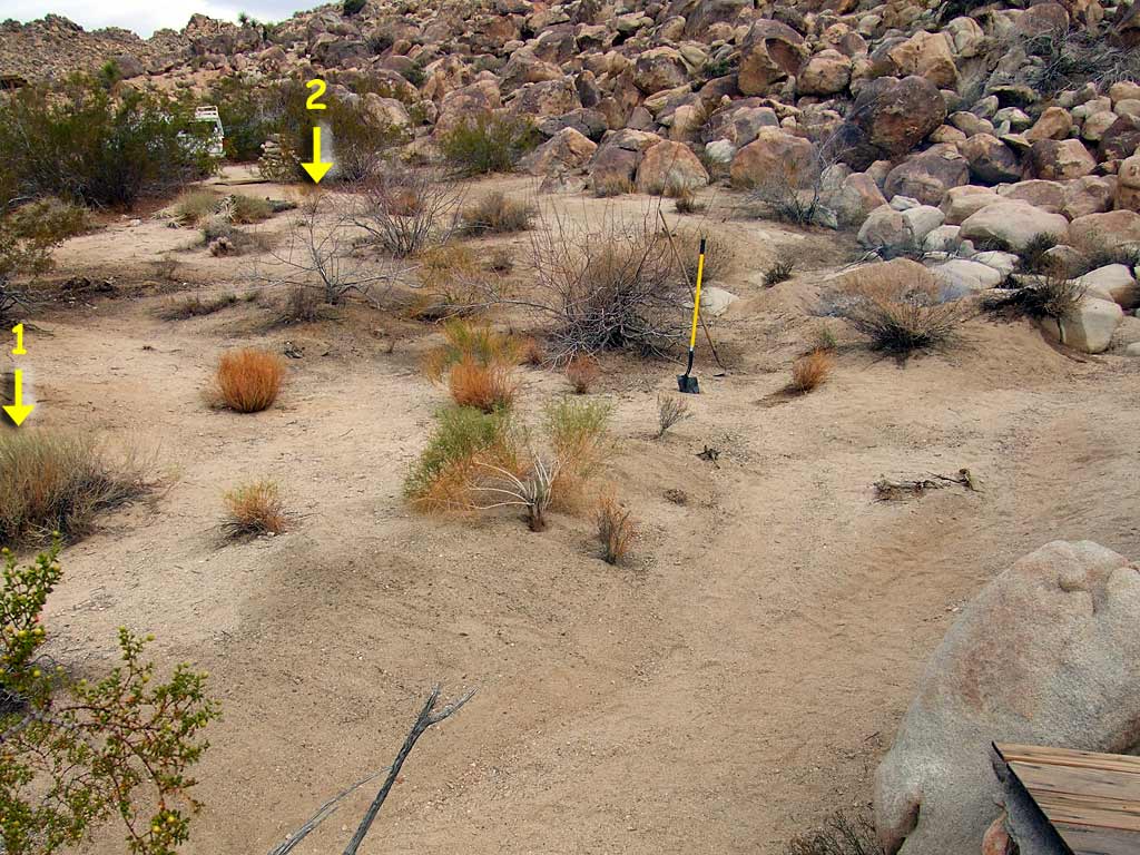 | This image shows the wash after the dead dry brush, potential firestorm fuel, has been removed and burned in the pit seen above center on the right. The arrows point to two bushes that are also pointed to in the adjacent photo taken a year before the cleanup. This one was taken on Sunday, April 22, 2007 with a 5.1 megapixel Fujifilm FinePix Z1 camera. |