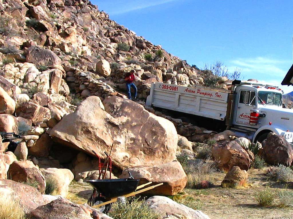 February 7, Getting our first load of driveway fill delivered by Action Pumping of Yucca Valley, CA