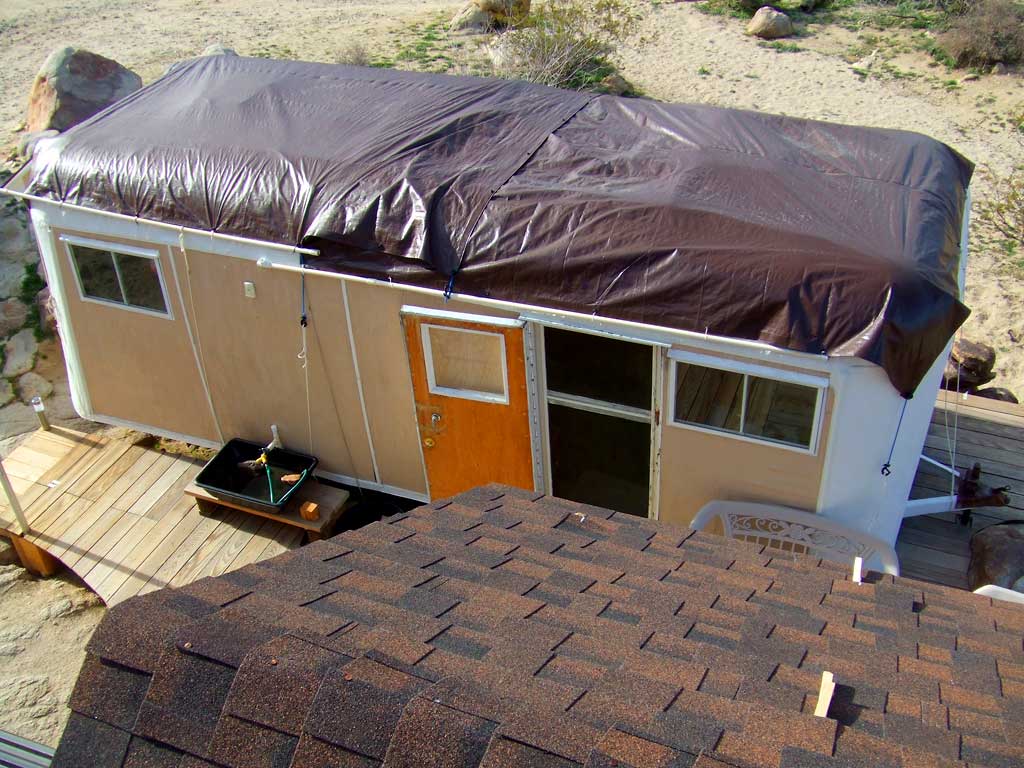 Tarps on the roof tied to PVC pipe and roped to the undercarriage of our renovated Branstrator trailer home