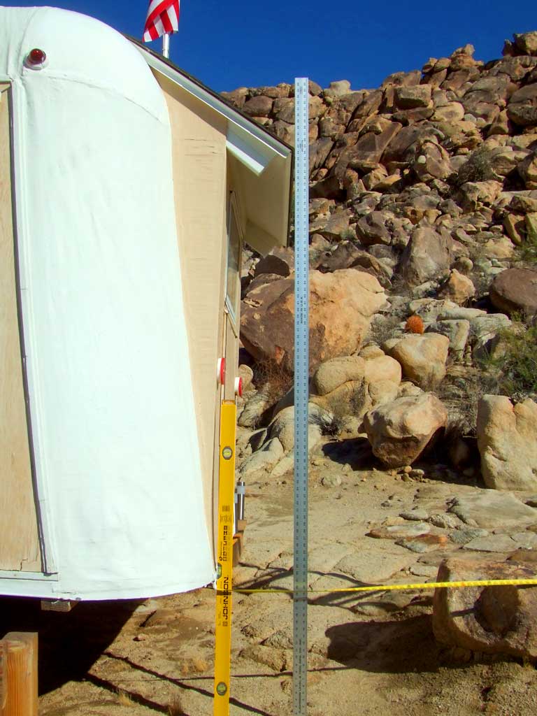 Measuring the roof height of our renovated Branstrator trailer home, 7' 4” from the deck surface, with an eight foot ruler