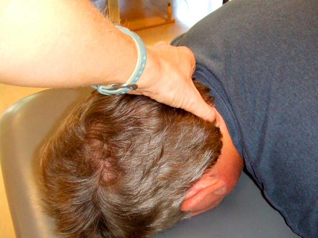 On our off-grid solar system, physical therapist Pam Roesch retraining my neck muscles at RHCI.