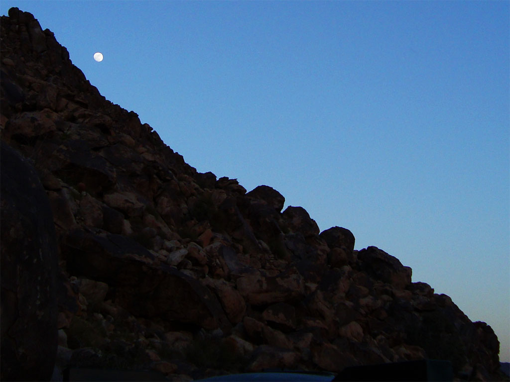 Full moon rising behind a Joshua Tree hill