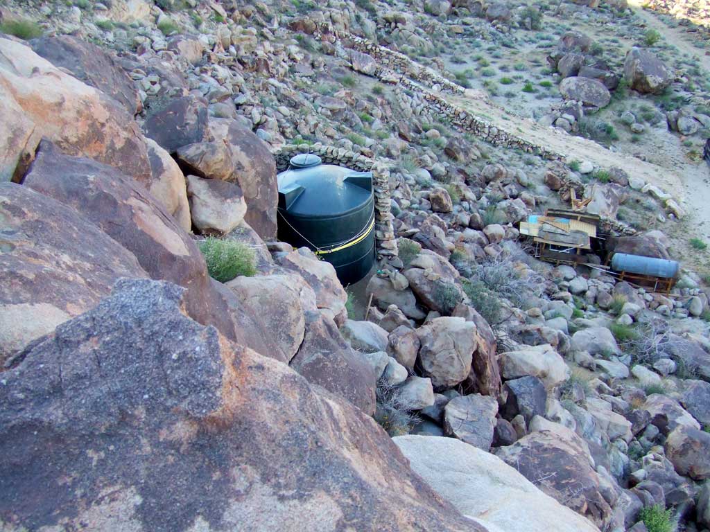 A long stone driveway below the partially completed water tank stone wall