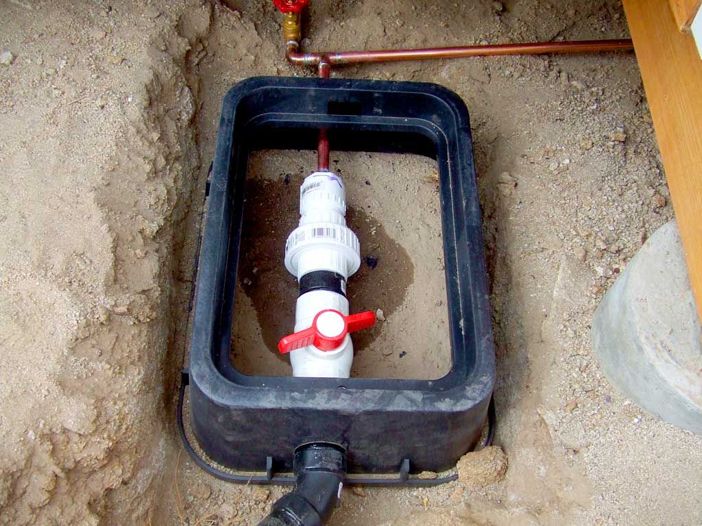 Inside an Orbit valve box: ABS pipe, PVC shutoff, union, adapter, copper pipe
