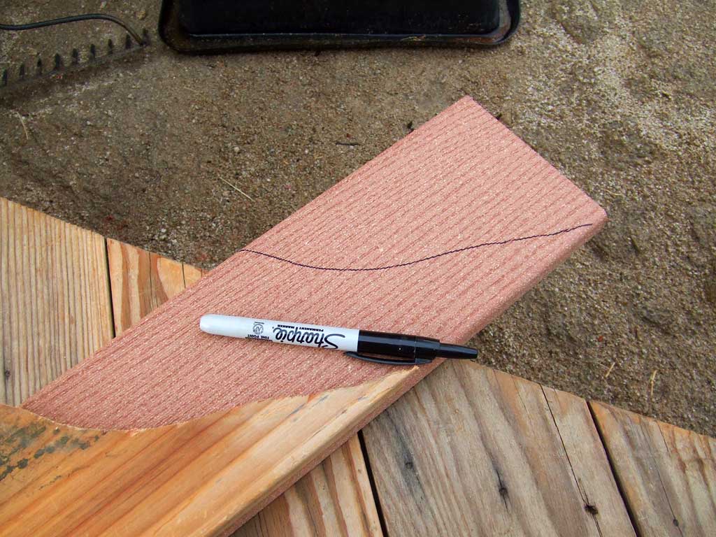 Using a template of scrap wood to fit the new Veranda composite decking around a boulder