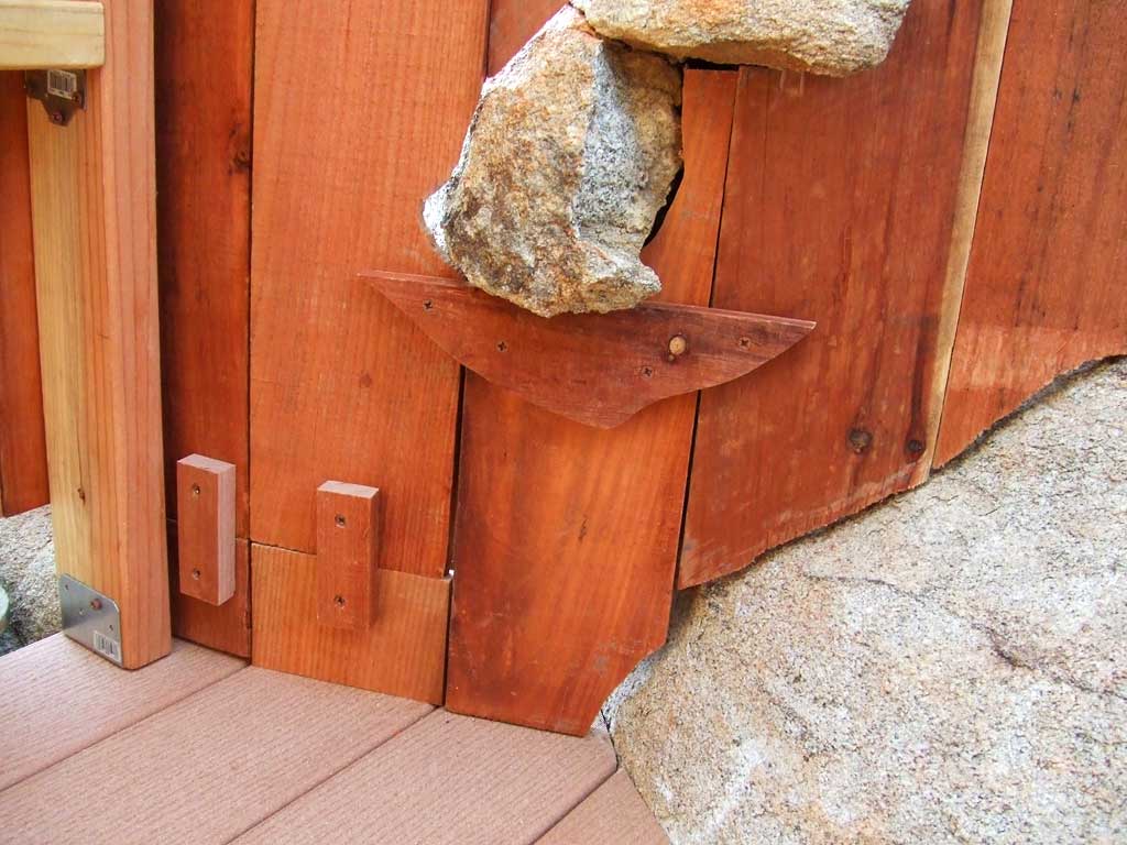 Holes beneath the rocks are covered to complete the outdoor shower wall
