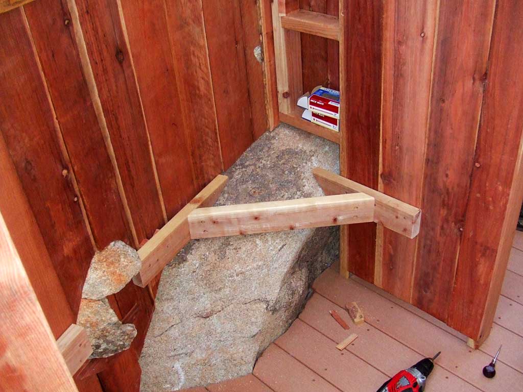 A bench for the shower's changing room is framed in around the boulder