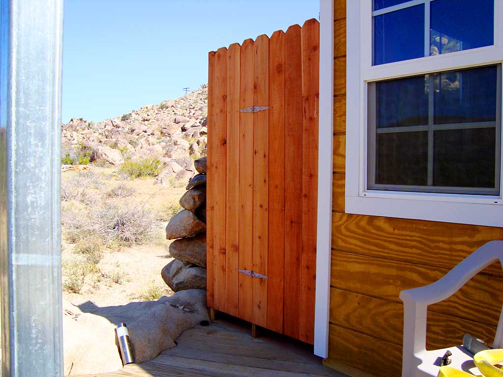 A cedar wall with an equal height gate to an outdoor shower stall