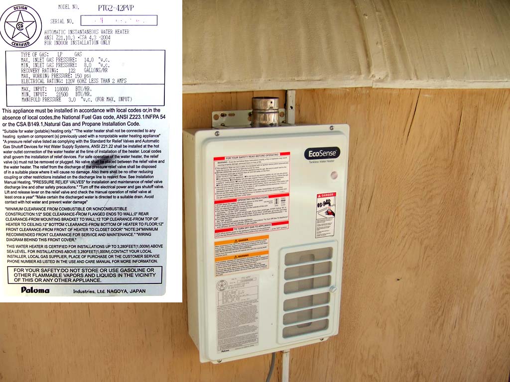 The Rheem '4.2 GPM tankless water heater LP propane gas' with specifications