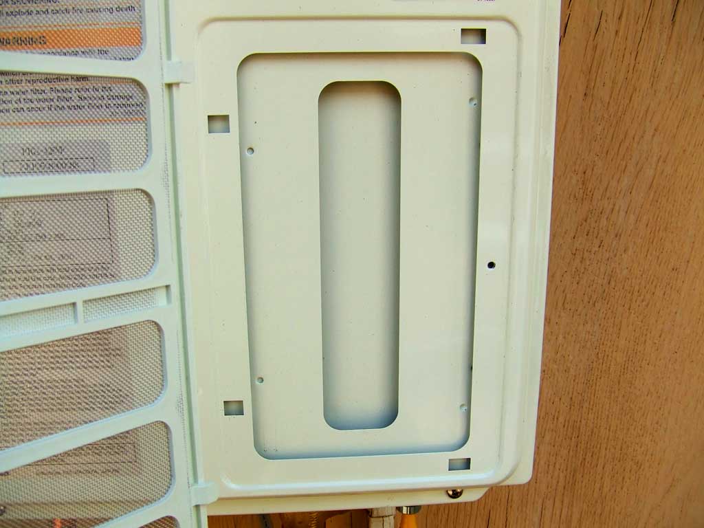The Rheem '4.2 GPM tankless water heater LP gas' air intake
