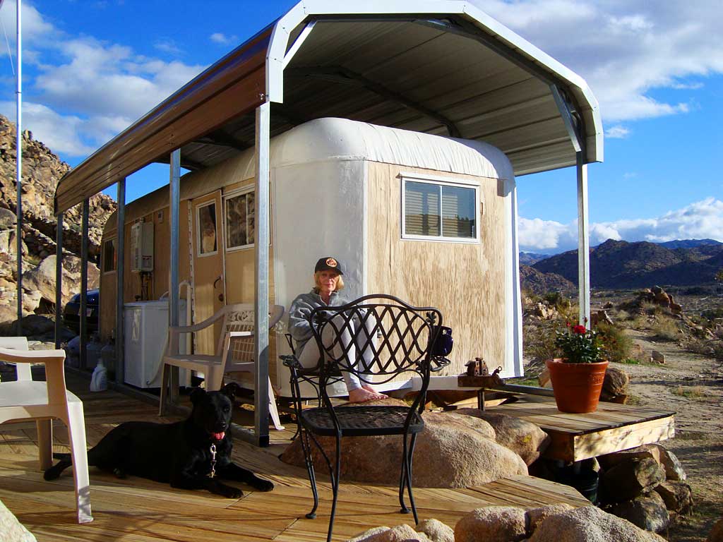 Eileen Blakeman, with Molly, relaxing in the wrought iron chairs she found in a local thrift shop
