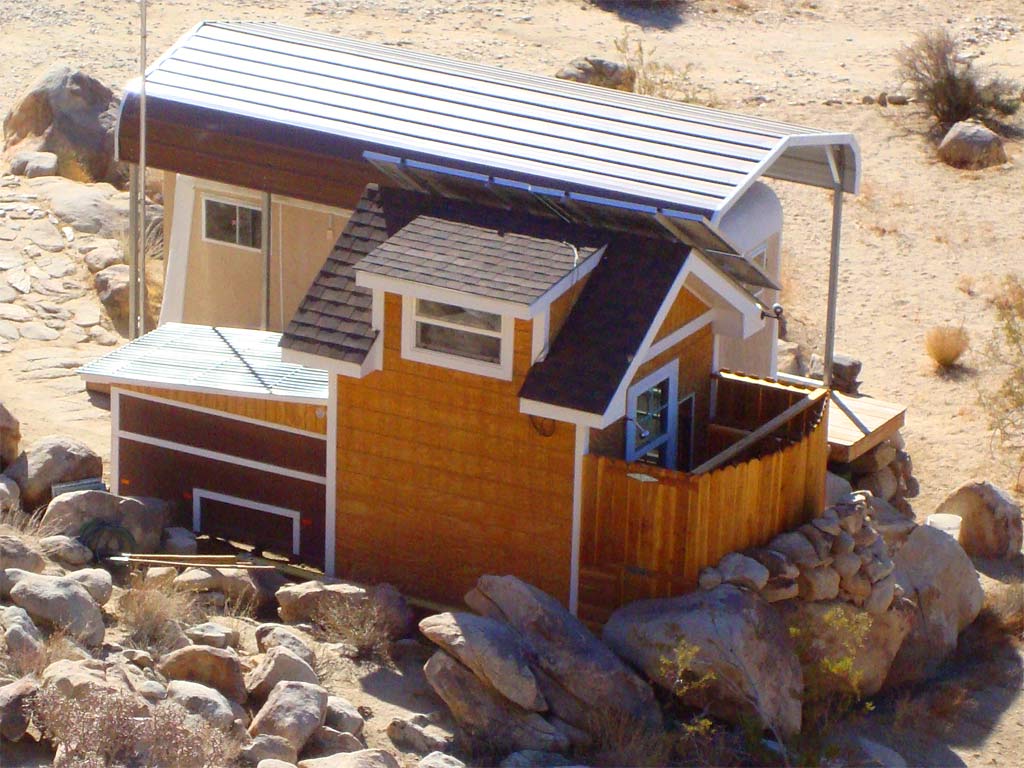 A Carolina carport over an antique trailer. Solar panels over a small house