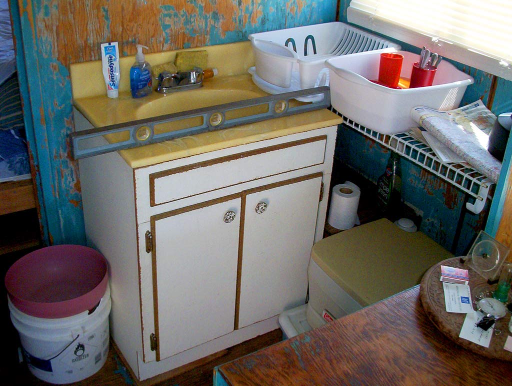 2004: Leveling the antique Branstrator trailer floor that became our "bathroom"
