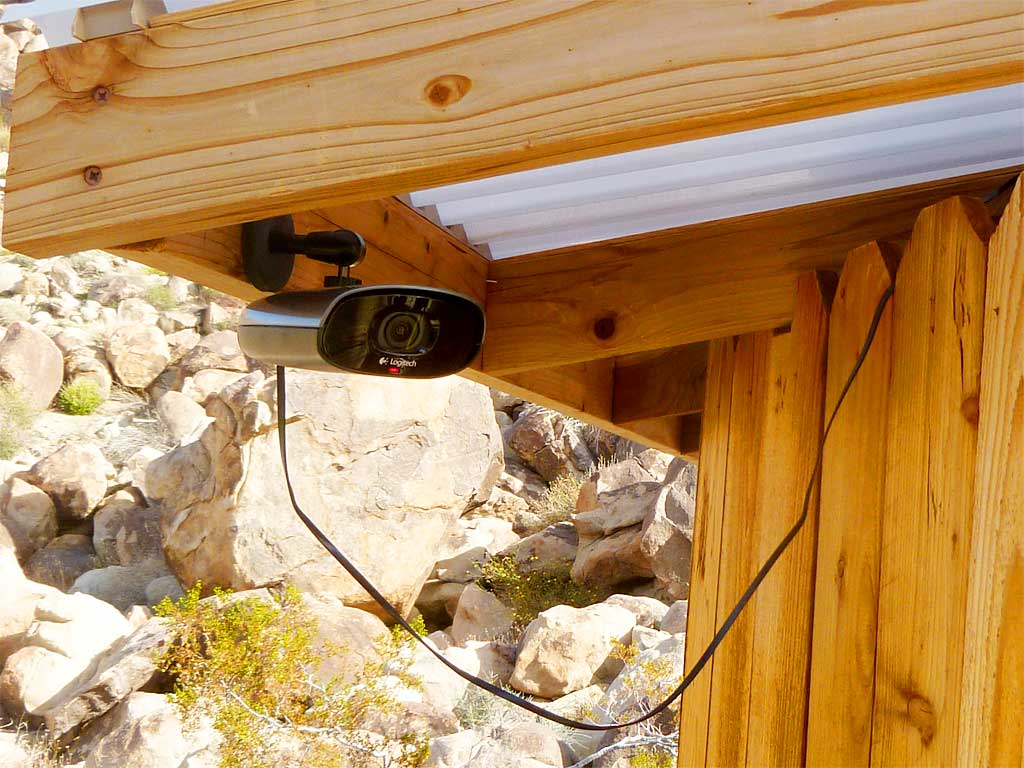 The Logitech Alert 750e web cam hanging on a flimsy mount but it works