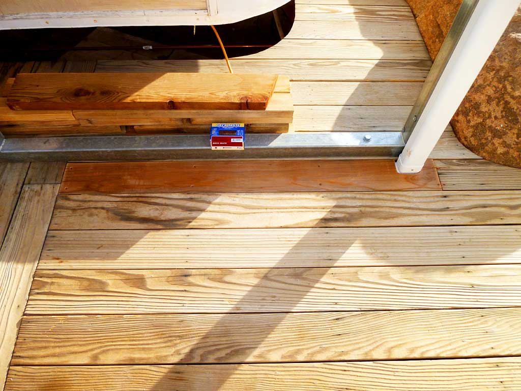 The decking around the Amerimax vinyl gutter downspout that leads to our pond