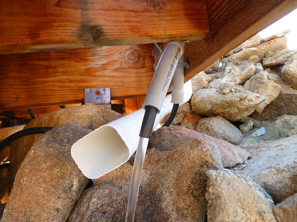 A vinyl Amerimax downspout brings rain to our pond. A pump recirculates the pond water.