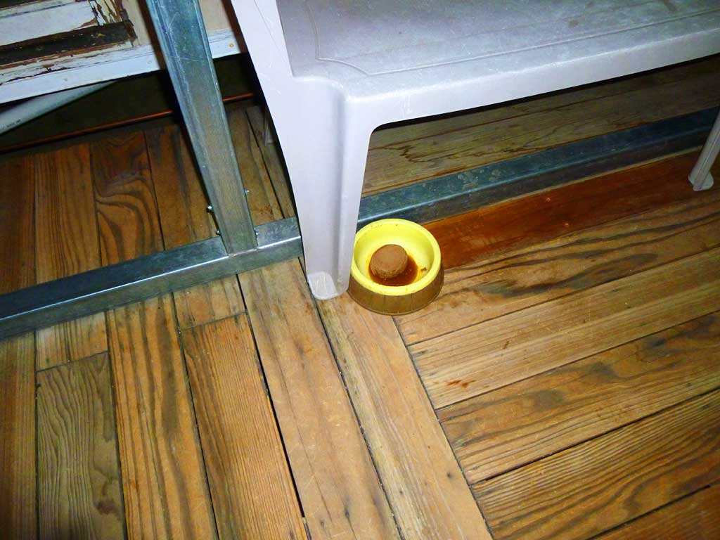 Cat food in the dog dish for a mysterious visiting cat