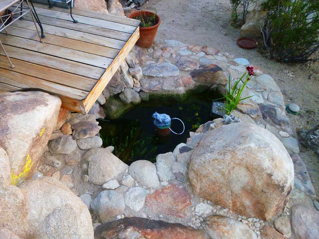 A grey water pond and a Louisiana Red Iris within a natural rock patio