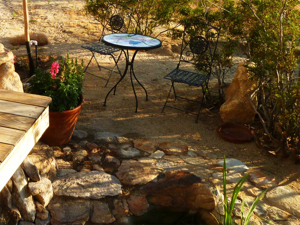 Spanish folding chairs and a cut-glass table and a pink Snapdragon flower on our patio
