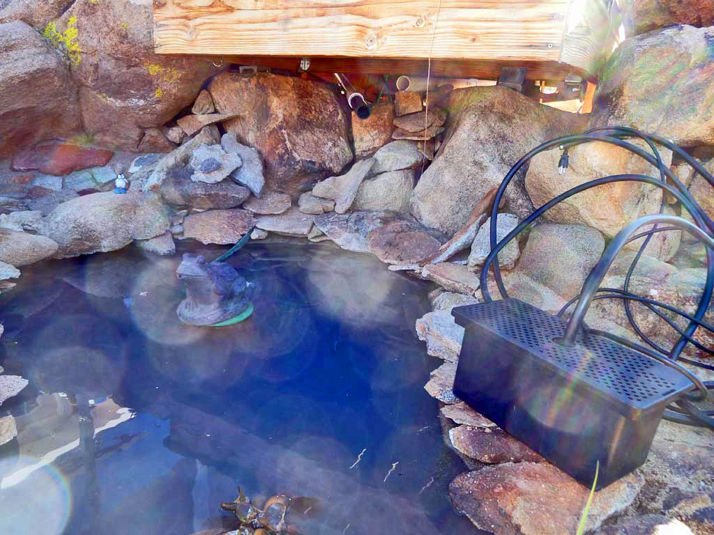 About to submerge the pump-filter in the preformed pond with hose & powercord feeding out beneith the rim rocks
