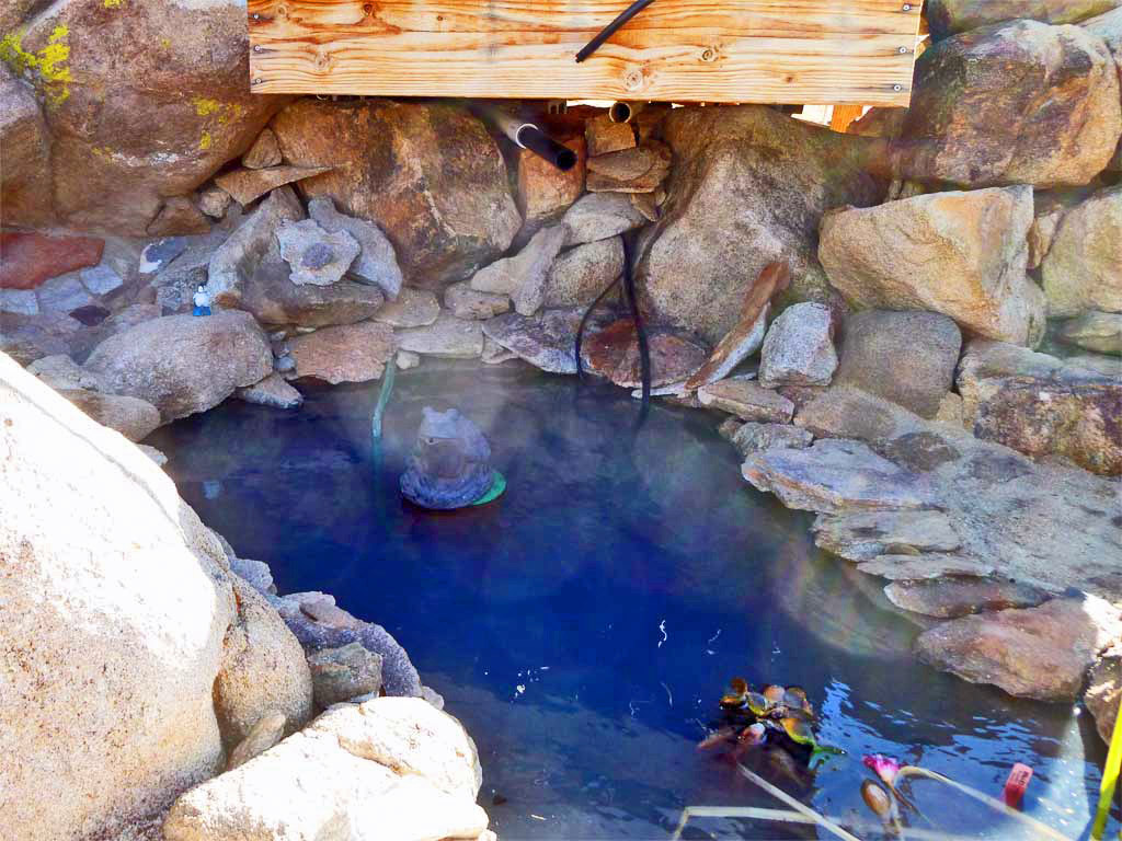 The only sign of the submerged pump-filter in the preformed pond is its hose & powercord feeding out beneith the rocks